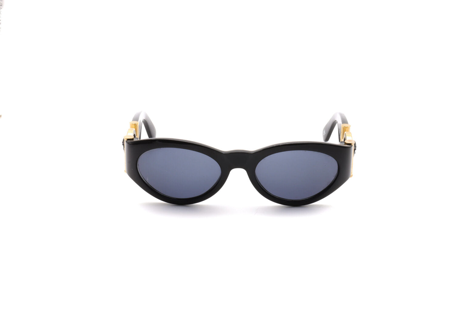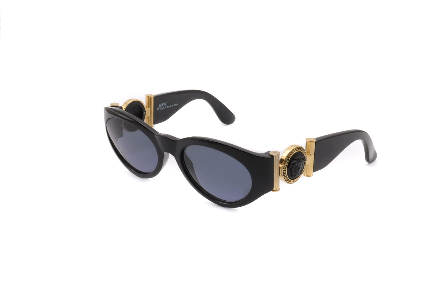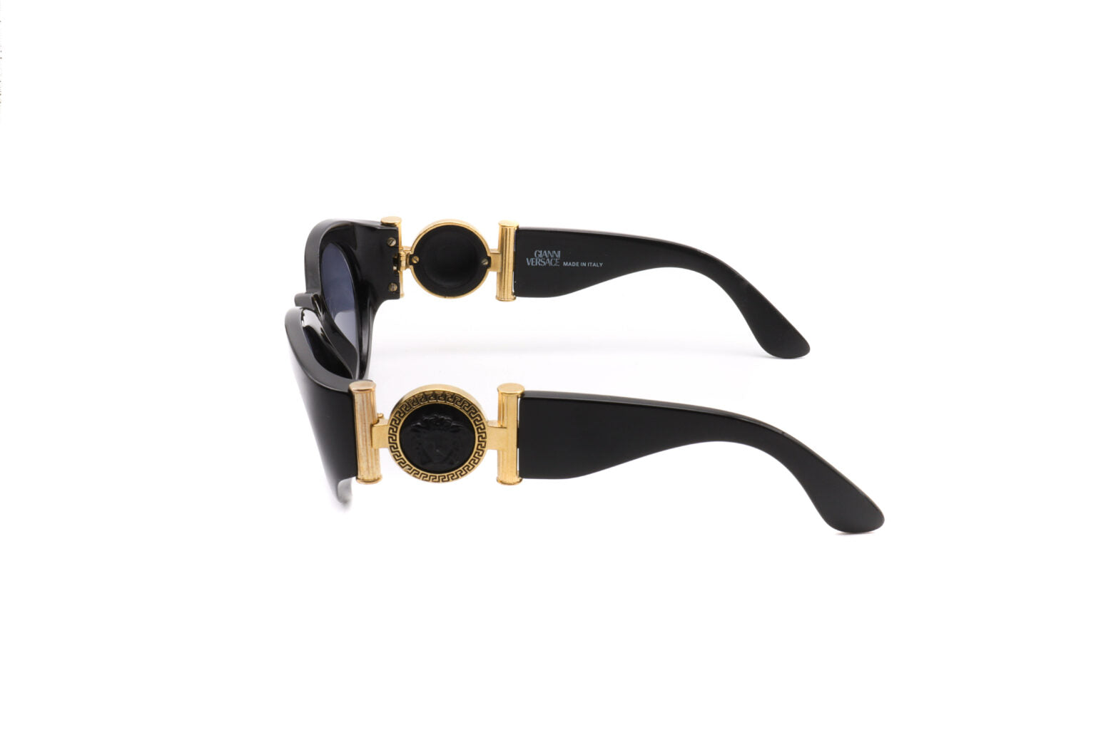 Description: The 1990s was a thrilling and glamorous time, epitomized by Gianni Versace and his fashion house. Gianni was a visionary designer whose bold and colorful creations, inspired by Greek mythology, were adored by celebrities. Sadly, his life was tragically cut short in 1997. Alongside fashion, hip hop music was also embracing a glamorous lifestyle, with famous artists such as Notorious B.I.G and Tupac showcasing their luxurious lifestyles on MTV. This era was characterized by champagne, silk shirts, and flashy Versace sunglasses with gold ornaments, which continue to be popular today. Vintage Versace sunglasses capture the glitz and glamour of this era, with black frames adorned with gold medusas reminiscent of the 90s. These sunglasses have been refurbished.