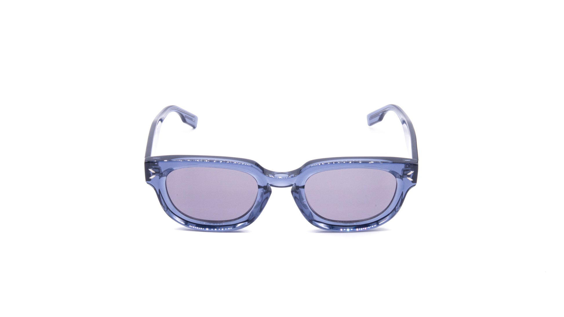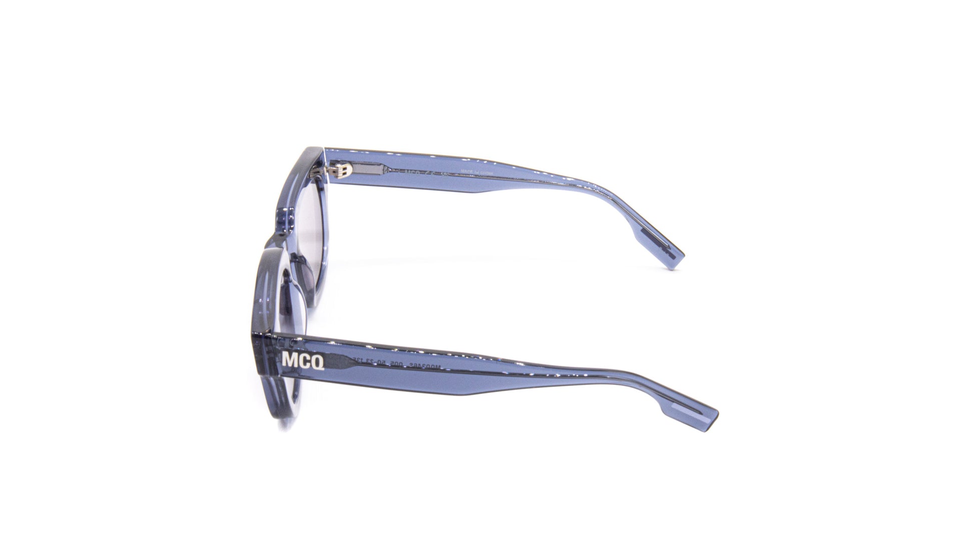 The MQ0346S-005 sunglasses by McQ Alexander McQueen feature a transparent blue acetate frame with a round (panthos) shape. They are designed for both men and women, offering a unisex appeal. The frame includes a keyhole bridge and sleek detailing on the front, with MCQ icons on the temples adding a touch of designer flair. These sunglasses blend contemporary design with classic elements, making them a versatile accessory for various styles.