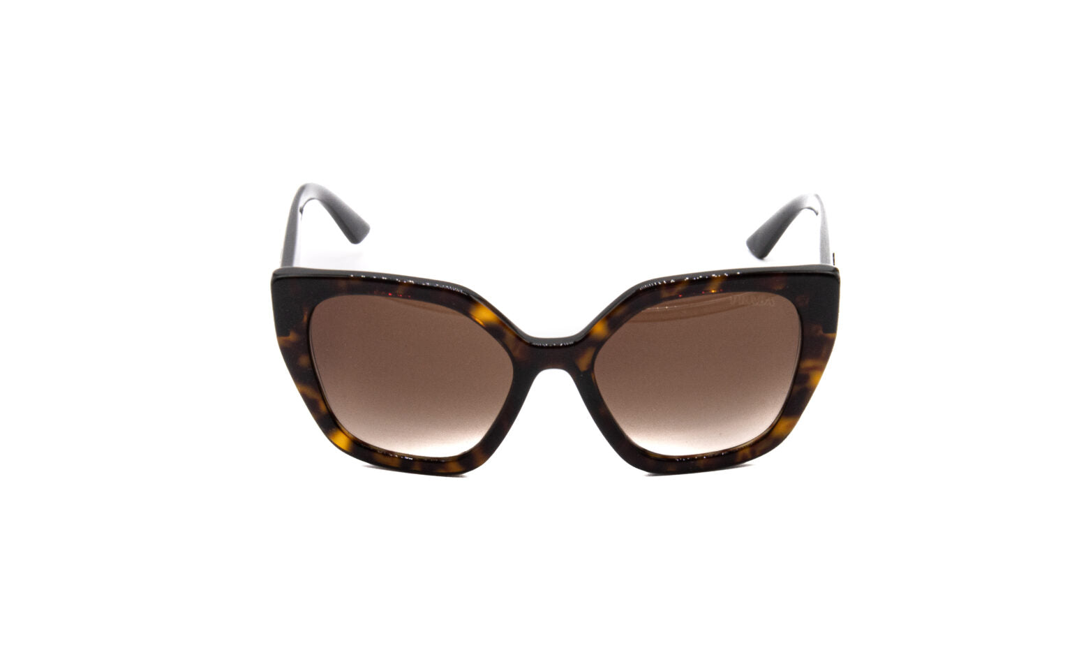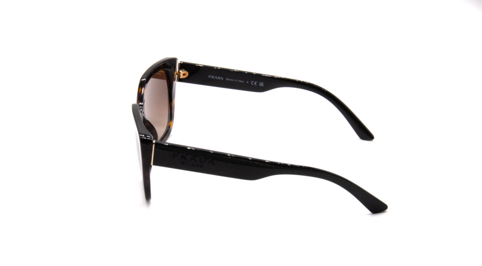 Description: The Prada SPR 24XS sunglasses feature a bold, angular cat-eye silhouette with a rich tortoiseshell front and sleek black arms, finished with the Prada Milano logo. Paired with warm brown gradient lenses, they offer a perfect mix of retro charm and modern luxury.