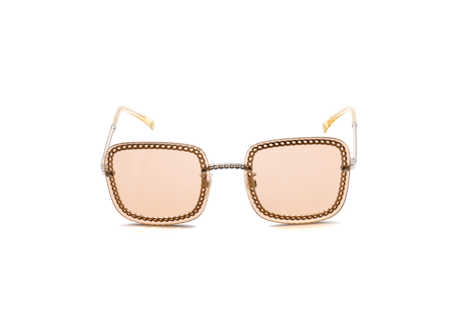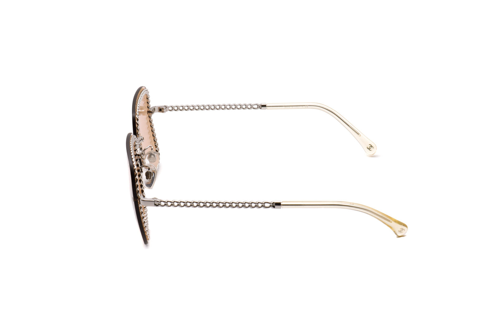 Description: The Chanel 4244 C.124/73 sunglasses feature a sophisticated rose gold metal frame, complemented by light brown lenses. The temples are adorned with the signature Chanel chain detail, adding a touch of elegance to the design. The dimensions are as follows: lens width 57 mm, bridge width 19 mm, and temple length 140 mm.