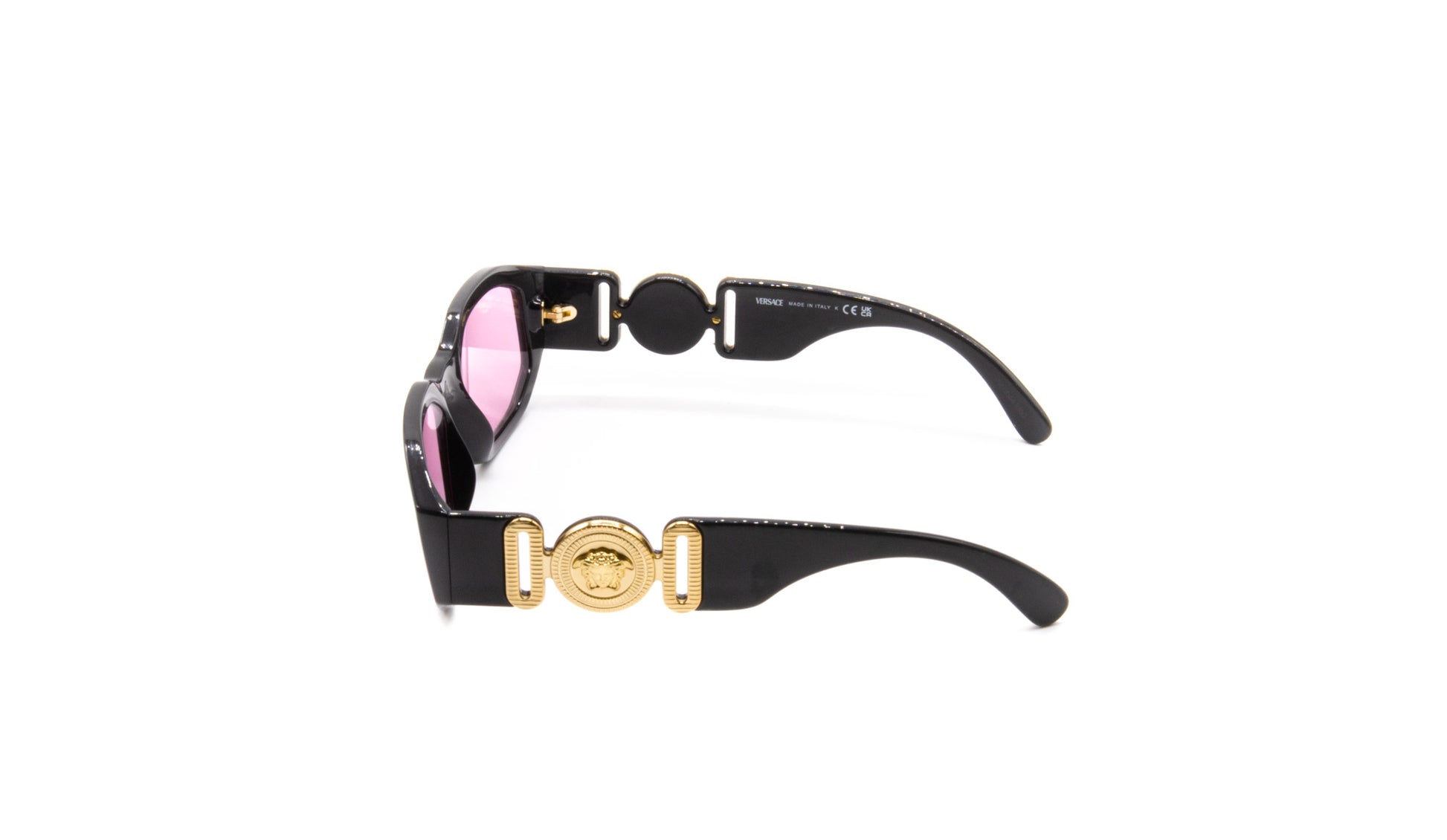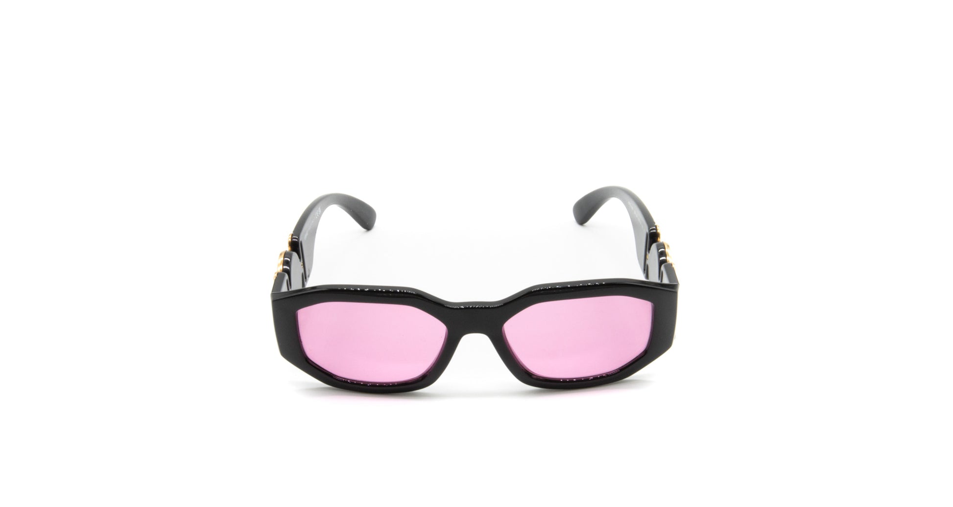 The Versace MOD. 4361 GB1/87 sunglasses are a stylish eyewear choice. With a glossy black frame made of durable acetate, they feature pink lenses for versatile visibility. The temple arms are adorned with the iconic Versace Medusa logo, embodying luxury and sophistication. These sunglasses combine fashion and function and a bold statement piece. These pink lensed Biggie sunglasses are a limited edition.