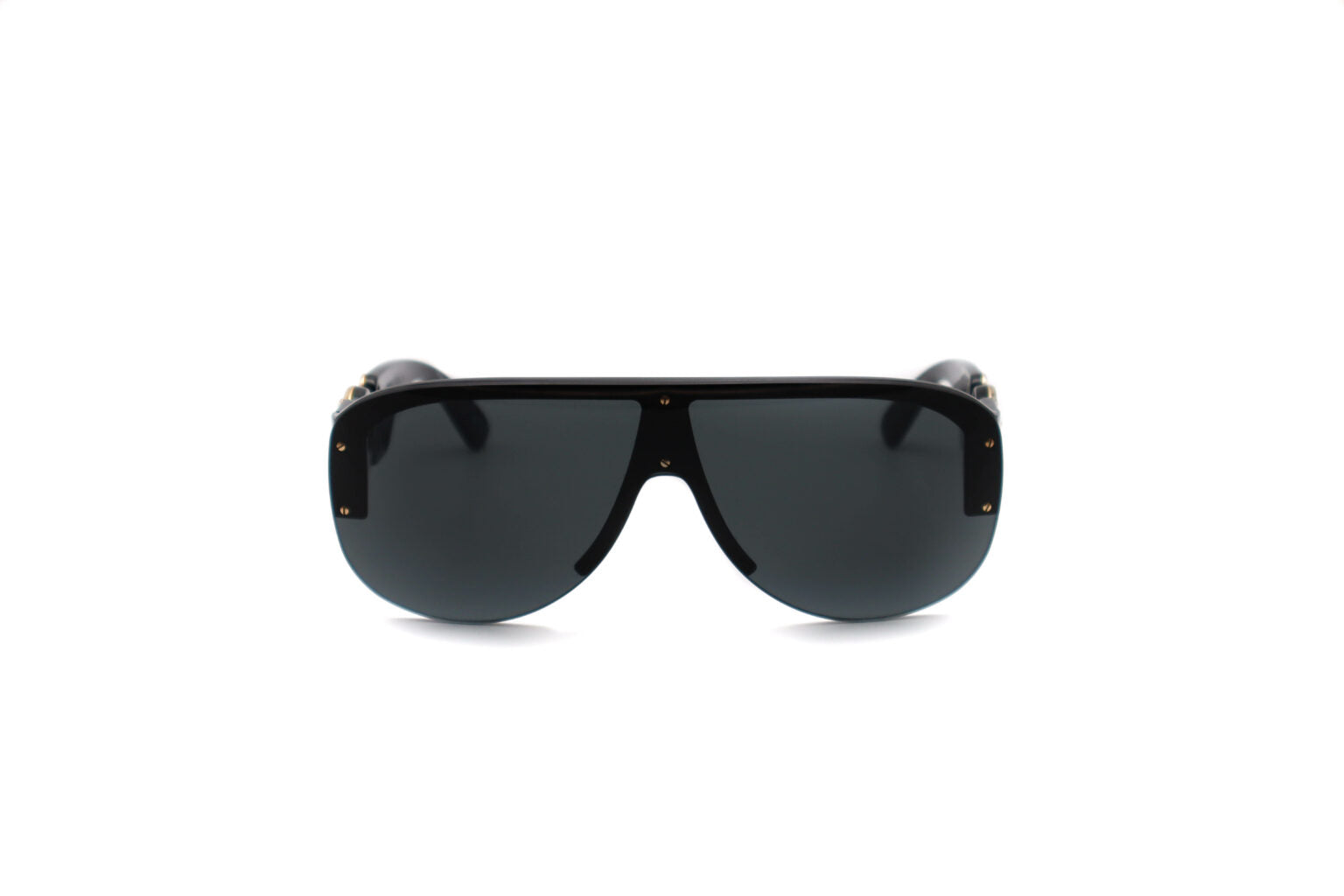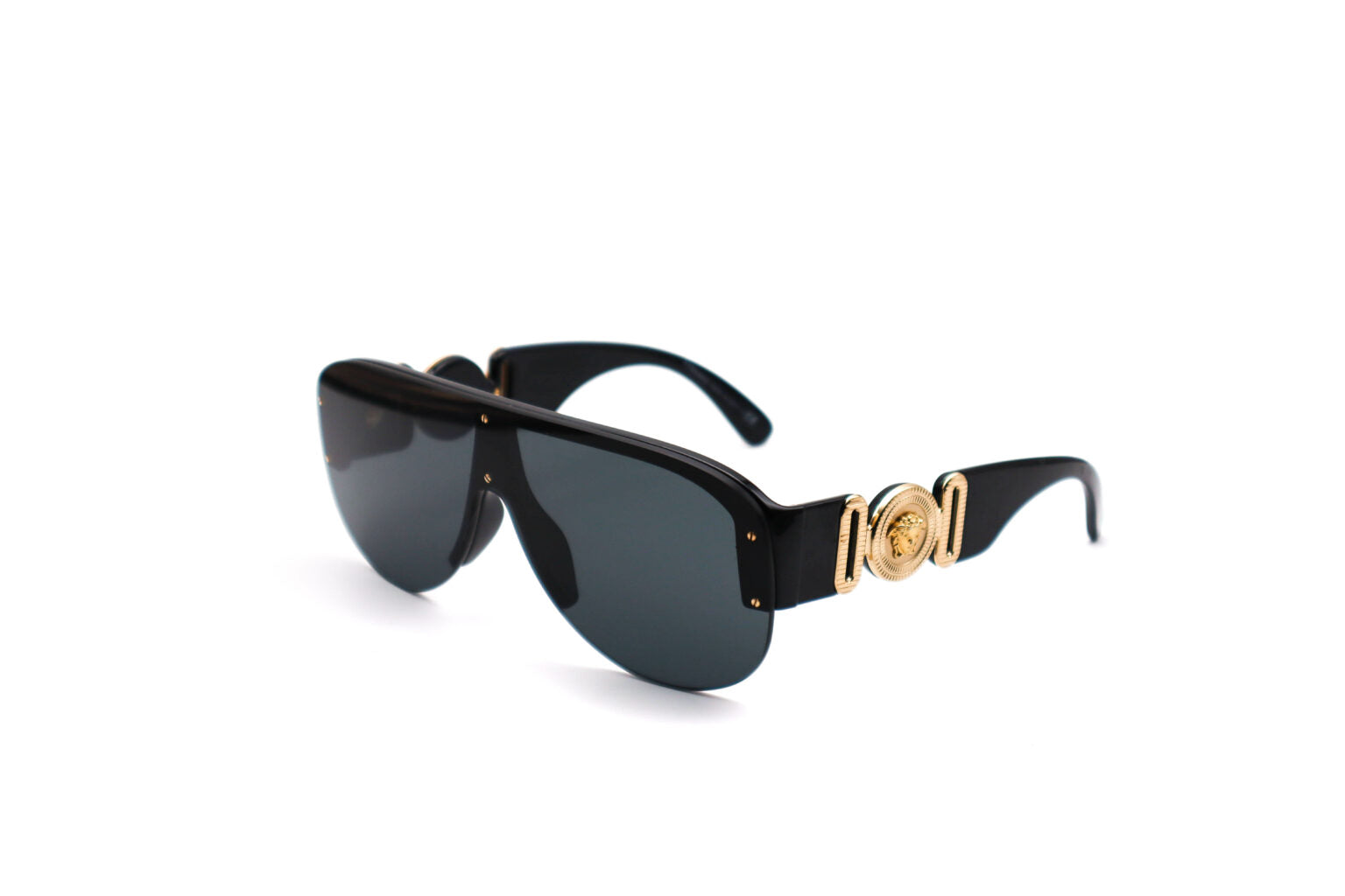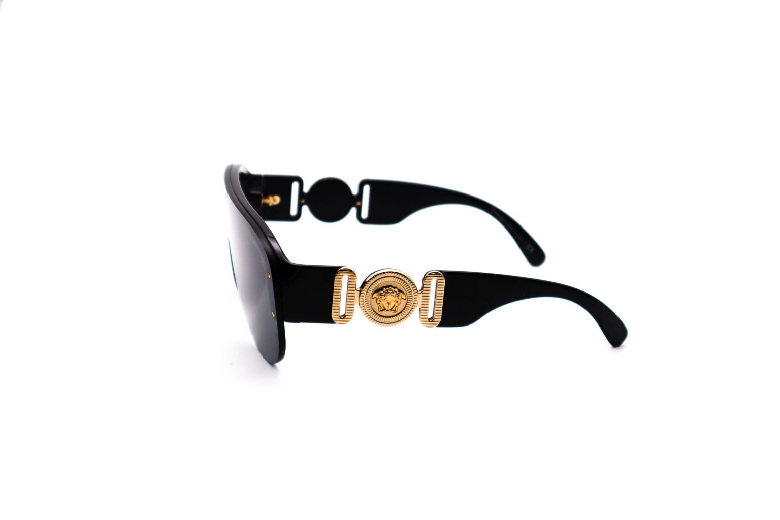 Description: The Versace 4391 GB1/87 sunglasses feature a bold black shield frame with dark grey lenses and striking gold Medusa medallions at the temples. With a 140mm temple length and standout hardware, they’re a true blend of vintage glamour and modern edge.